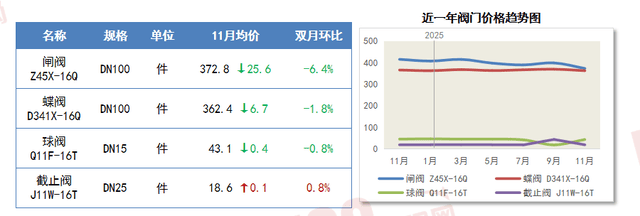 11月,对阀门价钱的支持感化削弱。叠加11月多地钢厂集中停产,环比均上涨0.1%;